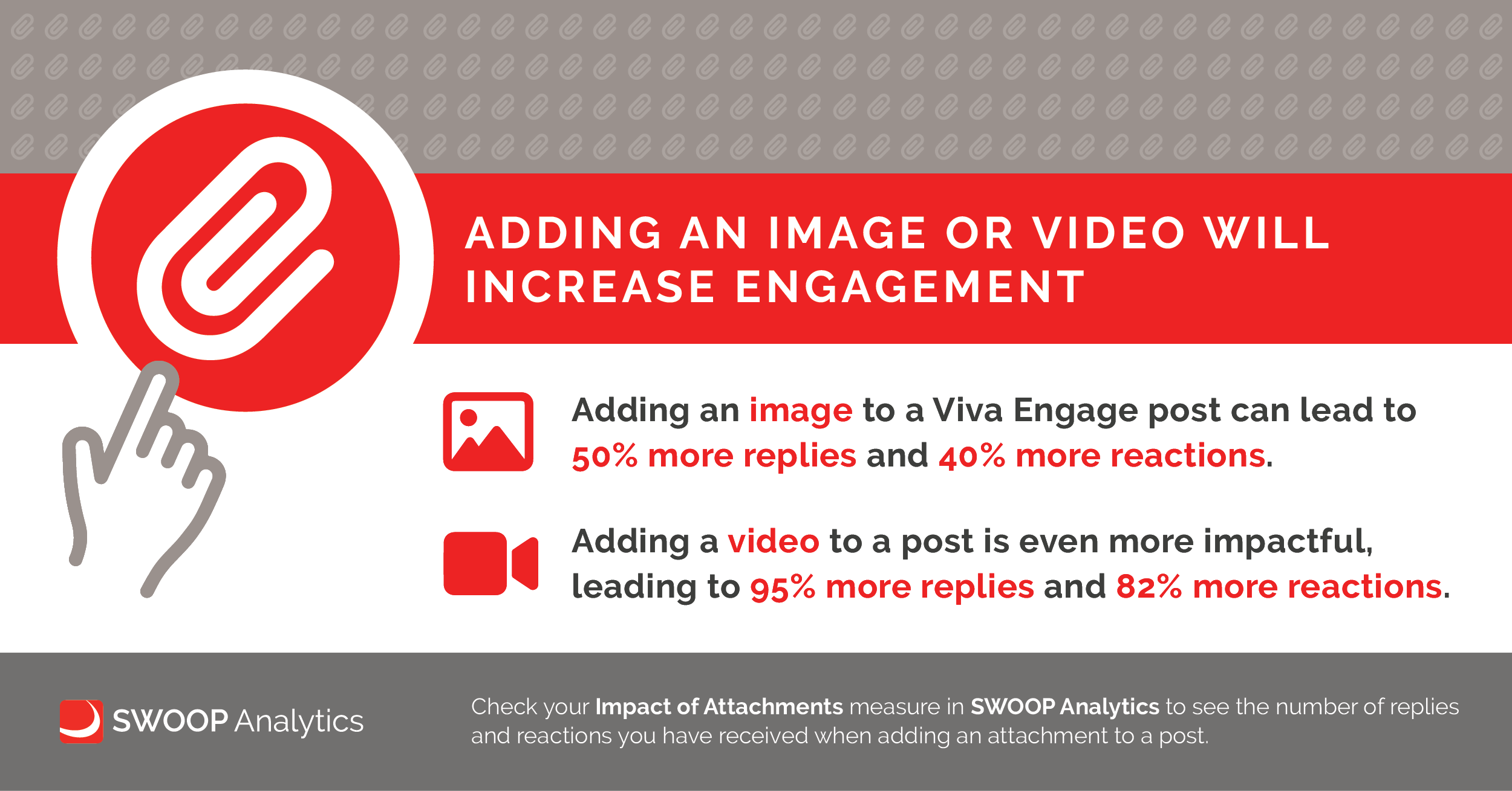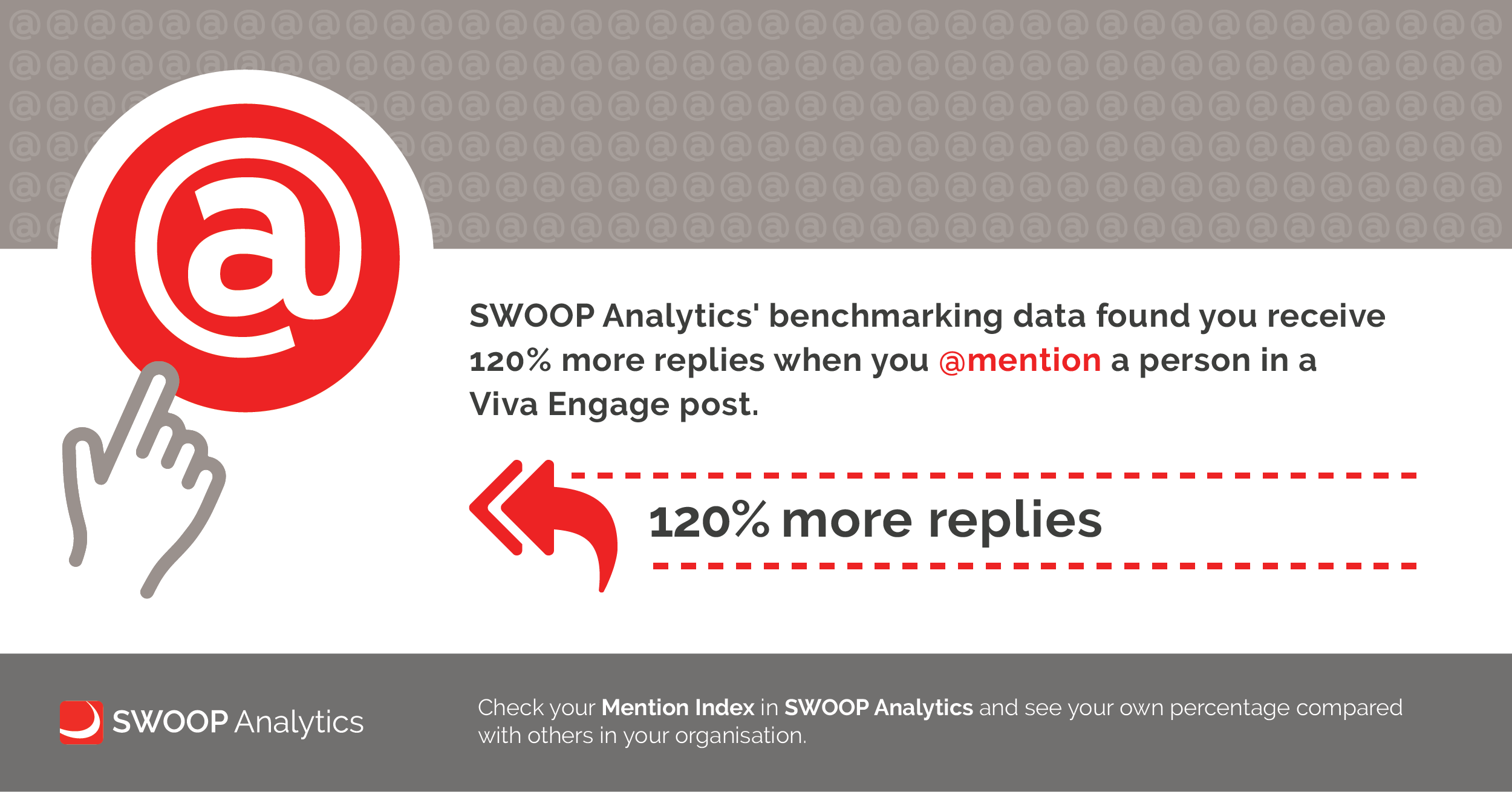 Often, these campaigns are based on tips from SWOOP Analytics’ benchmarking about interacting on Viva Engage through @mentioning, reacting, asking questions and replying to posts.