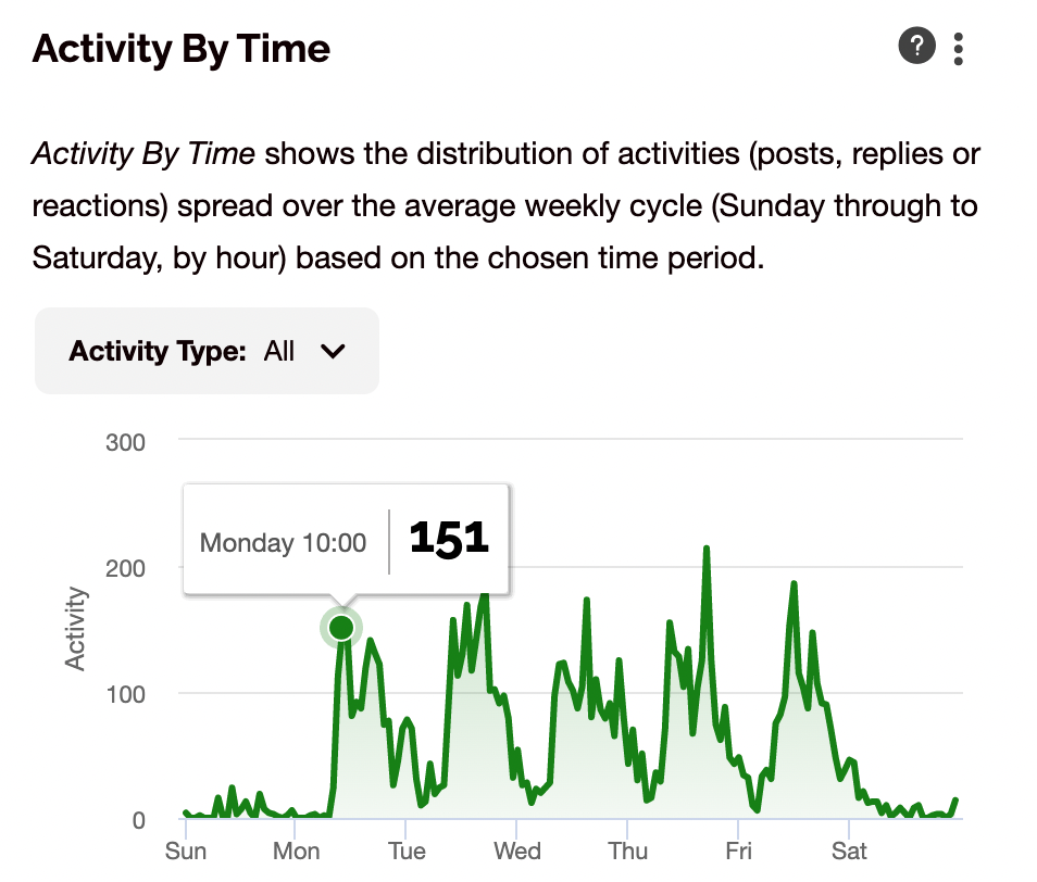 If someone wants to post news, they send their request to Kate, who has delegate access to post on their behalf. Kate will check the news schedule to see the best time to post to gain maximum engagement. She does this by checking SWOOP Analytics’ Activity by Time report to know when people are accessing Viva Engage.