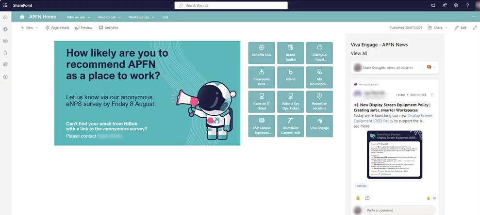 A screenshot AllPoints Fibre Networks’ intranet home page, with the Viva Engage feed on the right-hand side showcasing the APFN News community.