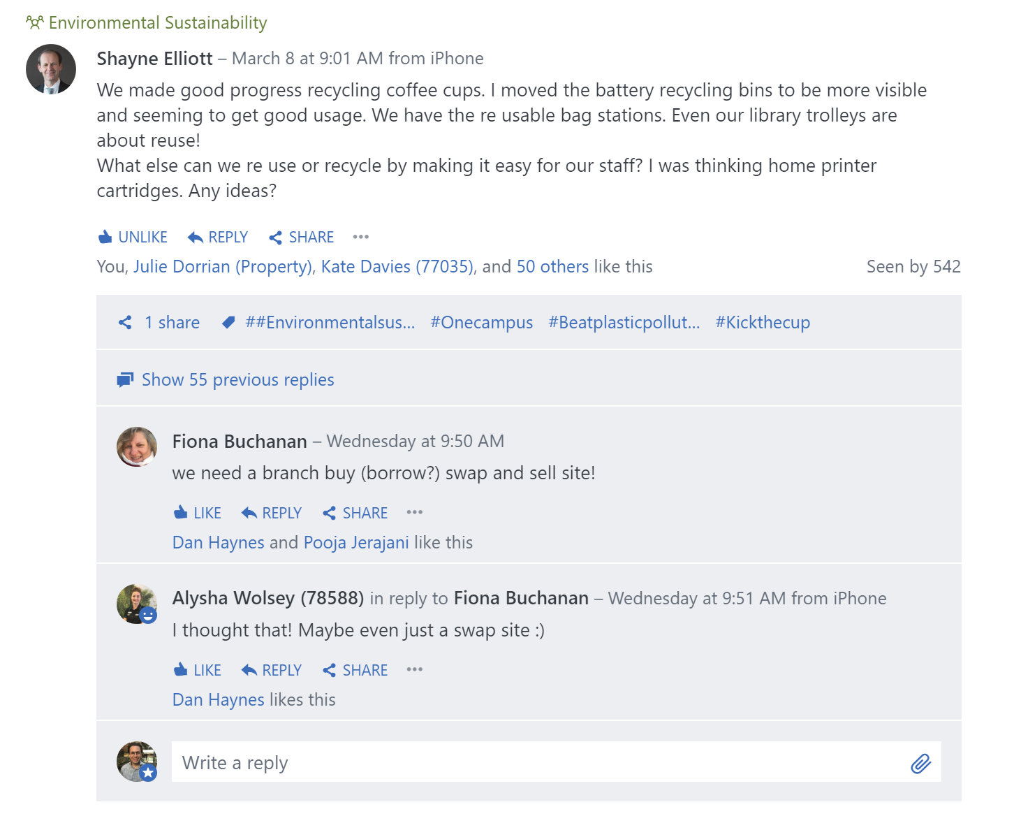 People now call each other out on Yammer when they see single use plastic promotional items, more and more of our events are now planned with sustainability in mind, and Yammer is helping employees share and reuse resources,” she said.