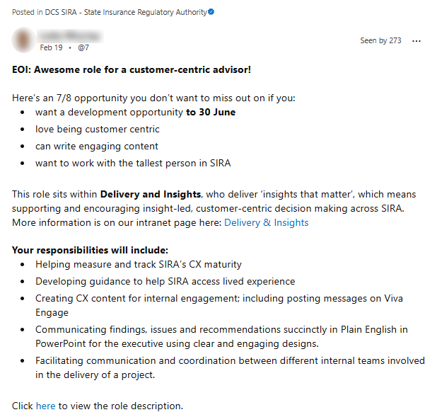 A SIRA team member sharing a secondment opportunity on Viva Engage.
