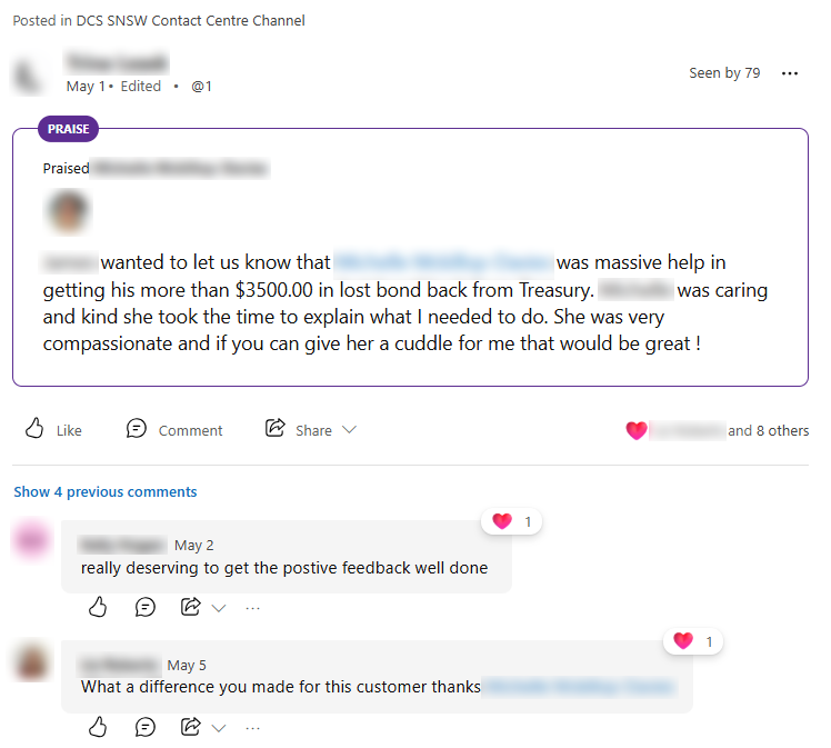 A praise post in the Service NSW Contact Centre Channel community after a customer provided praise for team member who helped them find more than $3,500 in lost bond money.
